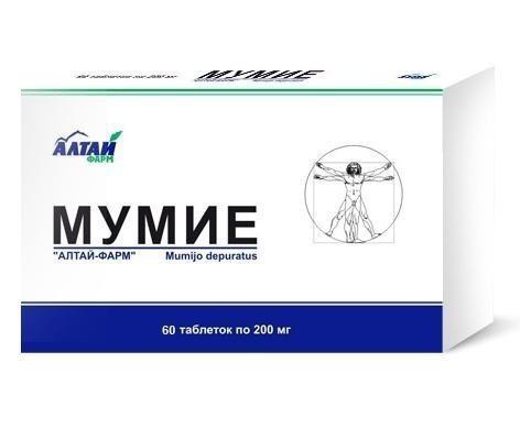 Препарат выпускается в таблетках по новой технологии, обеспечивающей максимальную степень очистки сырца мумие при сохранении всех его целебных свойств. Показания - при язвенной болезни желудка и 12-перстной кишки; при воспалительных заболеваниях желудочно-кишечного тракта; - при воспалительных заболеваниях верхних дыхательных путей; - при воспалительных заболеваниях урогенитального тракта; - при иммунодефиците; - при кожных заболеваниях; - при упадке сил, усталости, стрессах; - при неблагоприятных экологических условиях, при воздействии повышенной радиации, при химических отравлениях и других вредных для организма факторов. Способ применения Дневную дозу (1-2 табл.) мумие предварительно растворяют в 3 ст. л. теплой воды. Принимают по 1 ст. л. утром натощак, в обед - за 1 час до еды и вечером через 2-3 часа после еды перед сном. Курсовое лечение может быть двух видов: по данным одних исследователей курс составляет 10 дней с повторением после 5-дневного перерыва. При хронических заболеваниях необходимо 3-4 курса лечения. По другим дан данным курс непрерывного приема мумие должен составлять 25-30 дней с последующим 10-дневным перерывом перед повторным курсом. При переломах, гнойных ранах и язвах одновременно с приемом внутрь тампонируют раны по краям таким же раствором. При геморрое принимают мумие внутрь, а также смешивают (слегка разбавив водой) в соотношении 1:6-1:8 с медом и вводят в прямую кишку на ночь в течение 1-2 месяцев. Курс лечения повторяют после месячного перерыва. При женских заболеваниях (эрозия, воспаление) вводят тампоны с раствором 2 г мумие на 50 мл воды. Такой же раствор используют для аппликаций на десне при пародонтозе, накладывая смоченный тампон на пораженный участок на 20-30 мин. Для натираний при болях в суставах, радикулите растворяют 5 г мумие в 100 г меда и втирают в больное место ежедневно на ночь. Противопоказания Не рекомендуется при очень высоком артериальном давлении, в период выраженного кровотечения (маточное, кишечное, носовое и др.), беременным и кормящим женщинам, детям до 12 лет. Во время лечения противопоказан алкоголь. Срок годности 5 лет. |